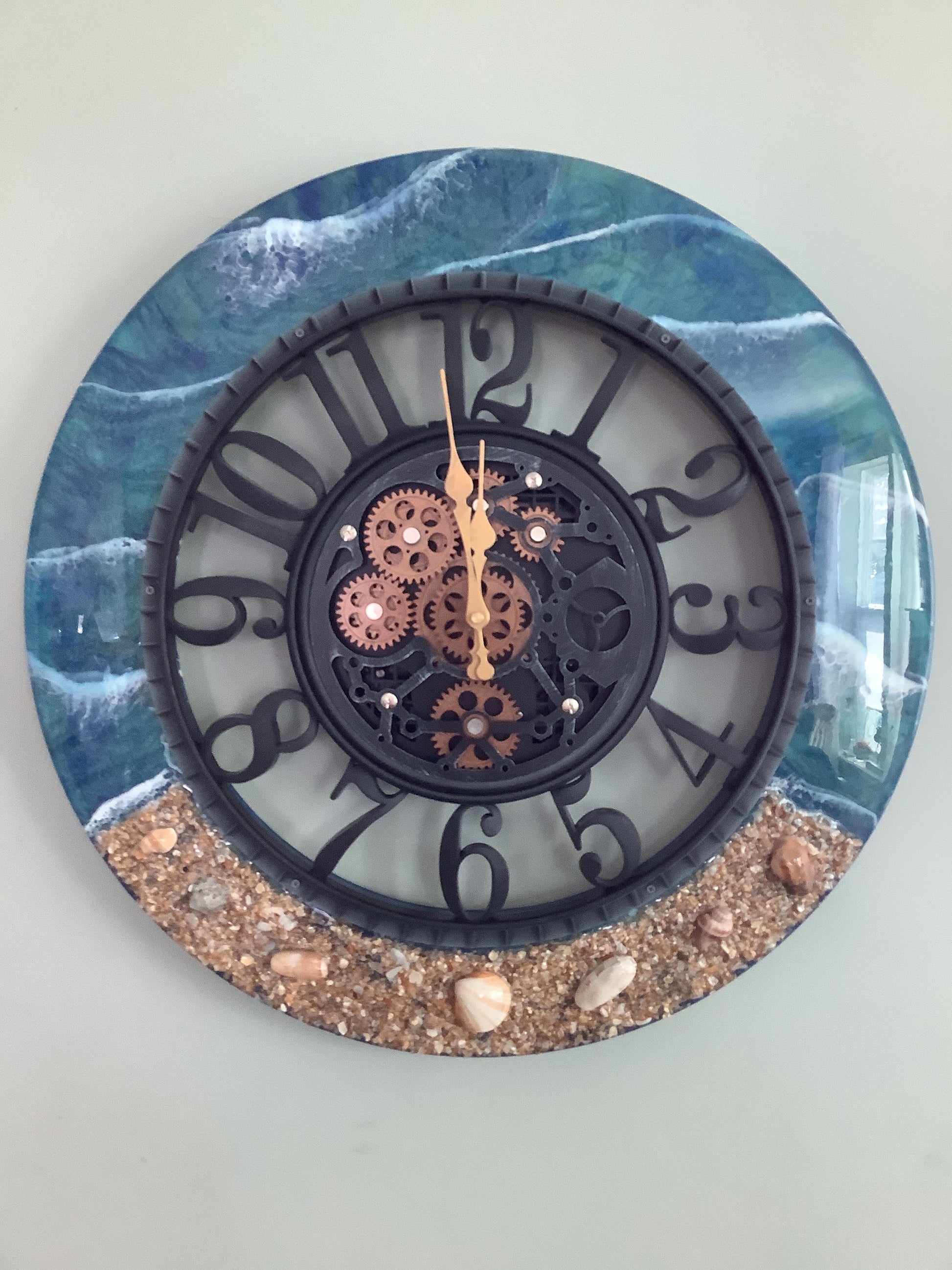Elevate your space with this stunning 21-inch wall clock featuring real moving gears that bring industrial charm to life. This clock features a see-through design that reveals the wall color behind it. Mounted on a handcrafted wooden base, the clock is accentuated with vibrant, multi-colored epoxy resin, creating a one-of-a-kind fusion of rustic and modern aesthetics. The clock has a built-in light sensor so the mechanical gears shutoff at night when the room is dark. Perfect as a functional timepiece and a bold statement art piece, this clock is ideal for living rooms, offices, studios, or any space that deserves a unique centerpiece.