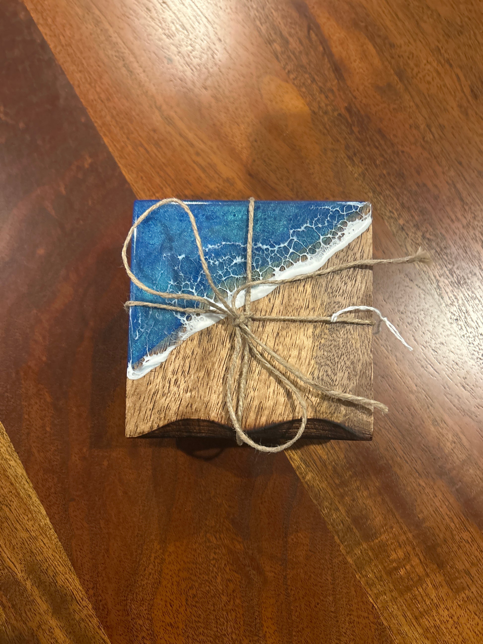 Add a vibrant coastal touch to your table with these 4-inch x 4-inch wooden coasters, each one coated in a glossy layer of colorful epoxy. Handcrafted for both beauty and function, the natural wood grain peeks through swirls of rich, ocean-inspired hues. Perfect for protecting your surfaces in style, these unique coasters bring a splash of color to any home or office. No two are exactly alike—each one is a little work of art.